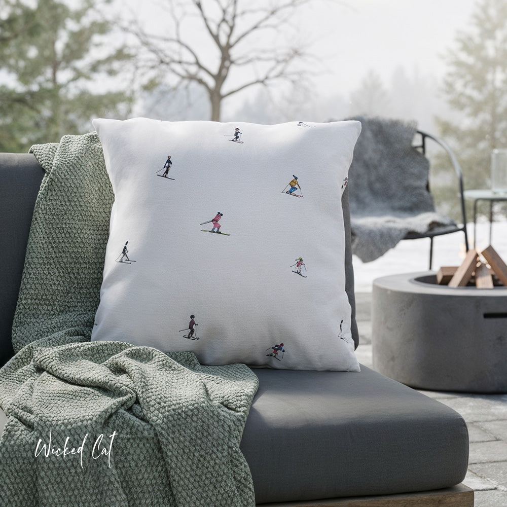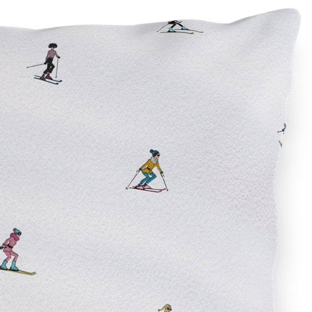This pillow features hand-illustrated, stylish skiers out for a day on the slopes.