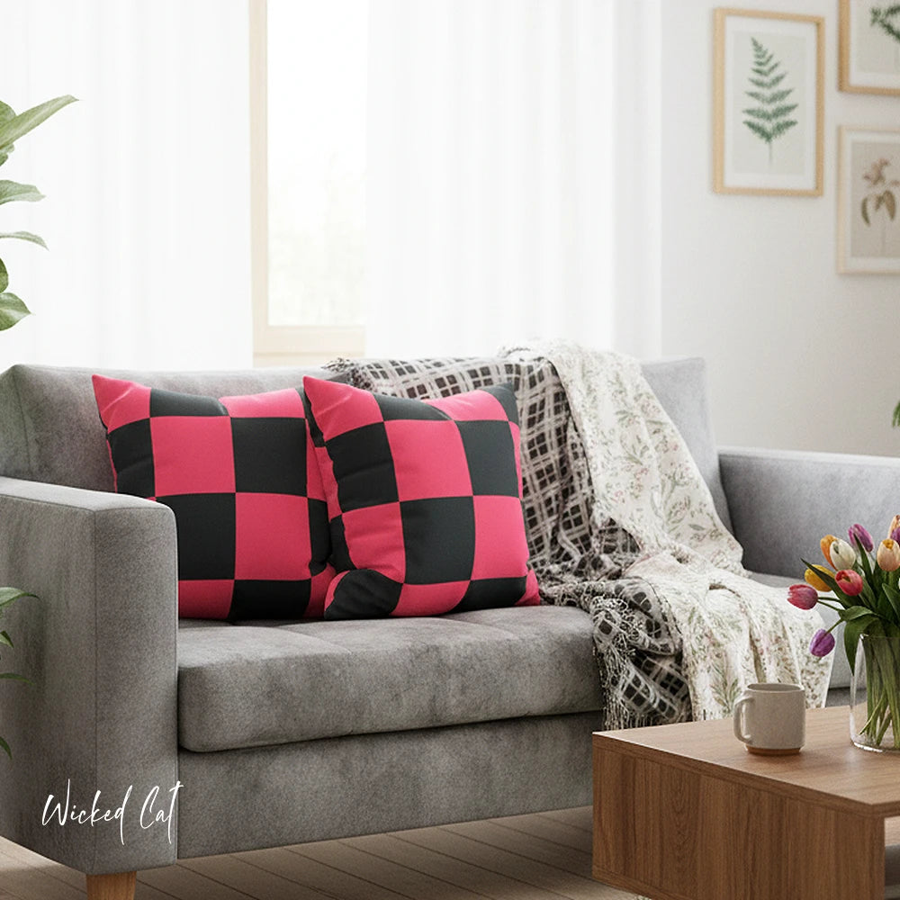Pink & Dark Grey Checkered Faux Suede Pillow Cover
