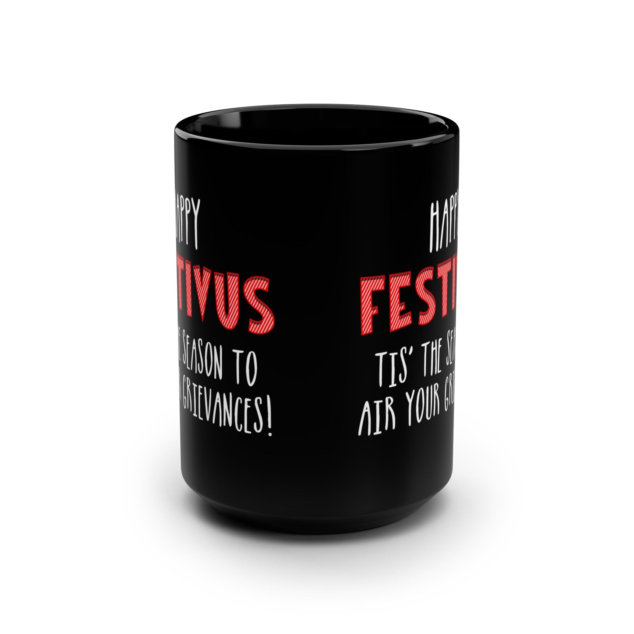 Funny Festivus mug perfect for airing grievances during the holiday season. This 15oz black ceramic mug features the phrase 'Happy Festivus Tis the season to air your grievances.' Ideal for adults looking to add some humor to their morning coffee or tea. Perfect for home, office, and Seinfeld fans.